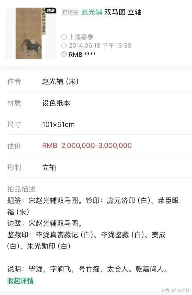 这件国宝,先后在2001年广州华艺、2002年上海敬华以8.14万成交,又在2014年上海嘉泰拍出230万天价。更令人震惊的是,次年它再次现身拍卖会,喊价300-500万却流拍。