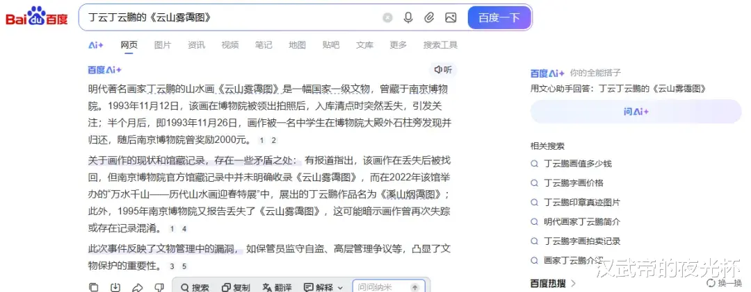 更耐人寻味的是,南京博物院在2022年举办的“万水千山——历代山水画迎春特展”上,展出了一幅丁云鹏的《溪山烟霭图》。一字之差的两幅画作,究竟是媒体当年报道有误,还是南京博物院用其他画作混淆了视听?至今没有明确的说法。有业内人士猜测,当年被找回的《云山雾霭图》可能被贴上了“赝品”标签,送入了所谓的“赝品库”,之后又被以“调剂”的名义流出了博物馆。