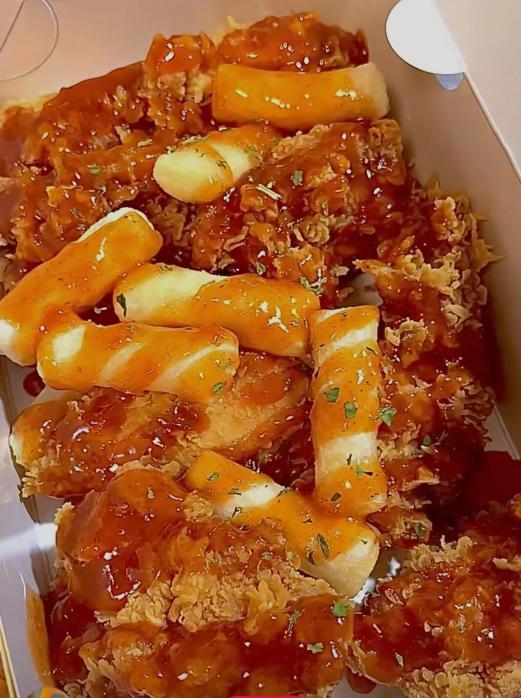 韩式炸鸡店,口味多样选择丰富。蒜香酱油炸鸡外皮酥脆,裹满酱汁,蒜香浓郁不冲口。芝士年糕软糯拉丝,甜咸搭配超够味。