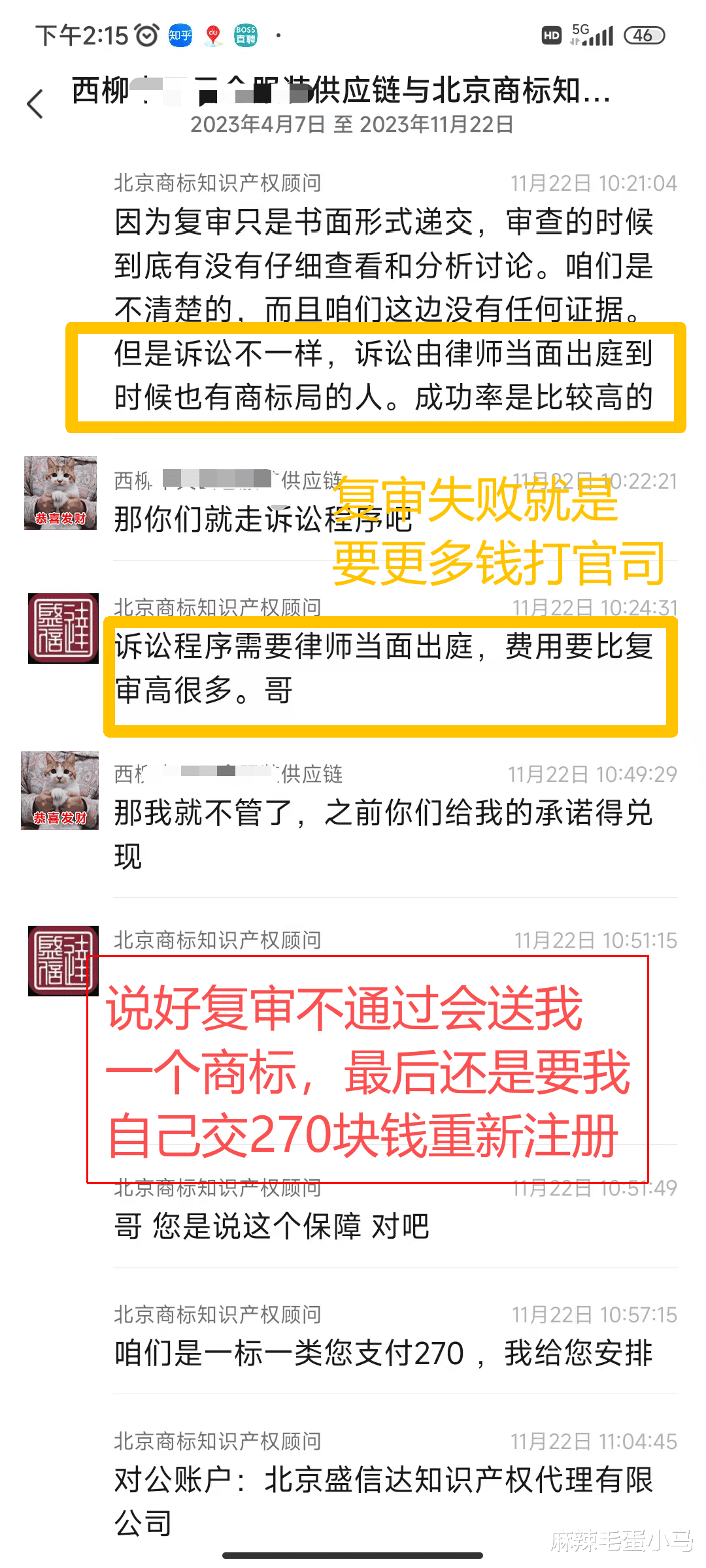 而且他们当初还跟我打包票,说保证复审能成,一定能看到商标局下发的《初审公告书》,证明商标复审成功。结果呢?全都没兑现,整个复审最后还是失败了