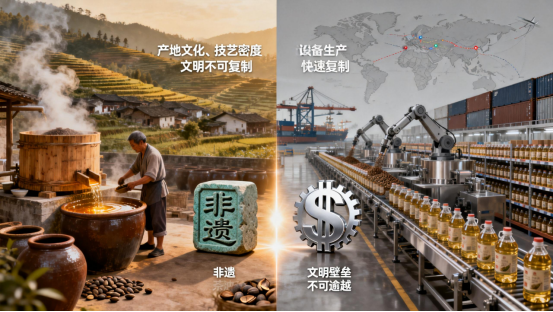 【本章总结】热榨茶油的护城河,是产地文化、技艺密度与文明结构共同构成的不可复制体系。它无法被工业复制、无法被资本吞并、无法被迁移、无法被标准化,因为它不是技术,而是文明;不是流程,而是文化;不是设备,而是经验。热榨之所以珍贵,不是因为它慢,而是因为它深;不是因为它古老,而是因为它成熟。