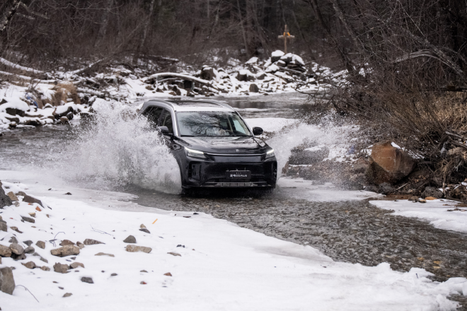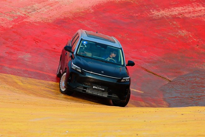 第三代蓝电E5 PLUS搭载的智能电混全时四驱系统,在满电和馈电状态下均可稳定输出四驱动力,支持爬坡、脱困等场景下的性能。在中汽中心于长白山的极寒实测中,车辆在满电、馈电状态下均成功通过冰雪陡坡,其爬坡与防滑安全性能得到验证。同时,在雪地、砂石、山路、河道等复杂路况下,其通过性与四驱稳定性也得到了验证。该系统可以提升全路况下的驾驶安全性。车辆还搭配FSD可变阻尼悬架与五连杆独立后悬,以兼顾操控与舒适。