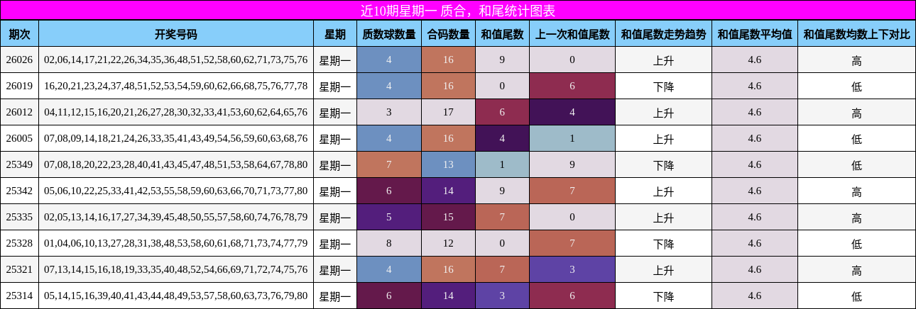 上图展示了近10期星期一的质合与和尾走势。可见质合比波动集中在4:16至6:14区间,7:13虽少,但并非不可能。和尾走势整体平稳,本期预测和值尾数下降,集中在 0-5 区间,尤其关注 2 附近,暗示和值可能回落至中低位区间,对号码组合的分布提出一定约束。