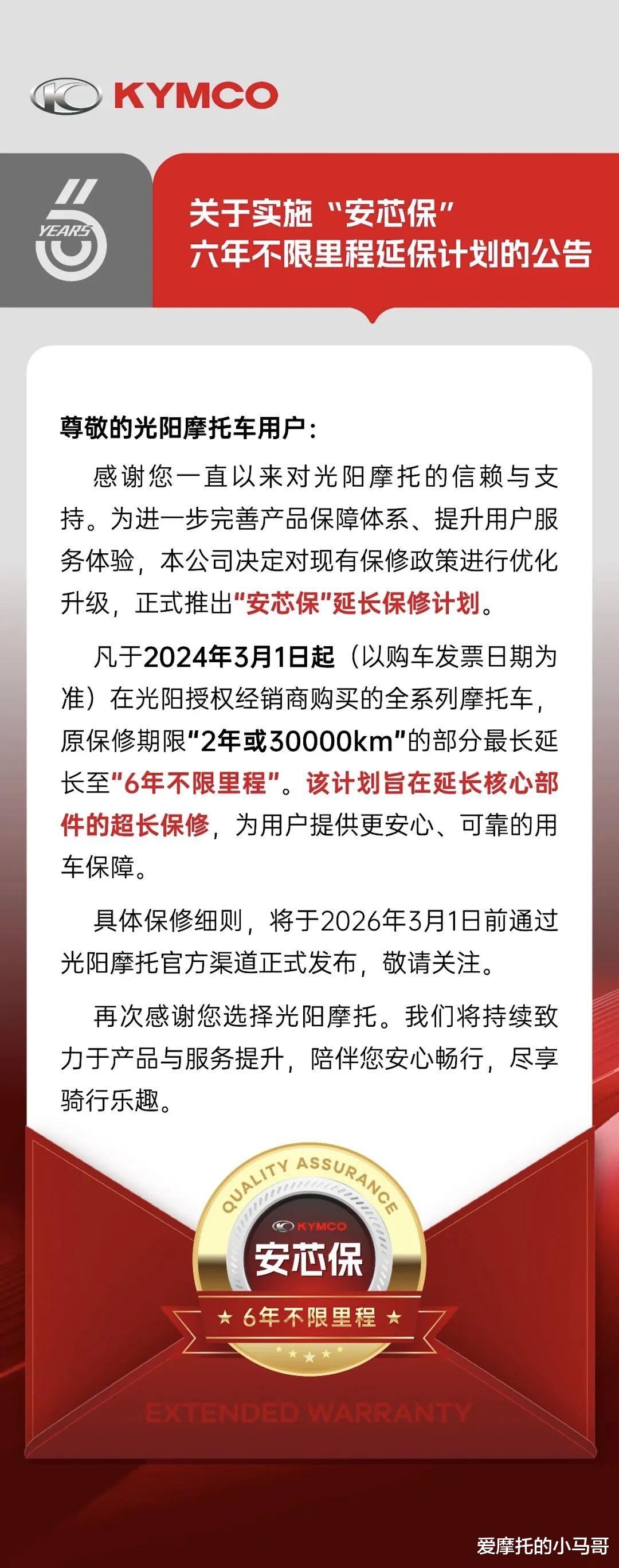 安芯保政策解读光阳的“安芯保”只要是2024年3月1日之后(以购车发票日期为准),在光阳授权门店买的任何一款光阳摩托,都能免费享最长6年不限里程的延保!直接把原来2年或3万公里的质保,给升级了一大截,而且保修范围跟原来2年的一样,核心部件全给你兜着,不会说延保了就缩水。