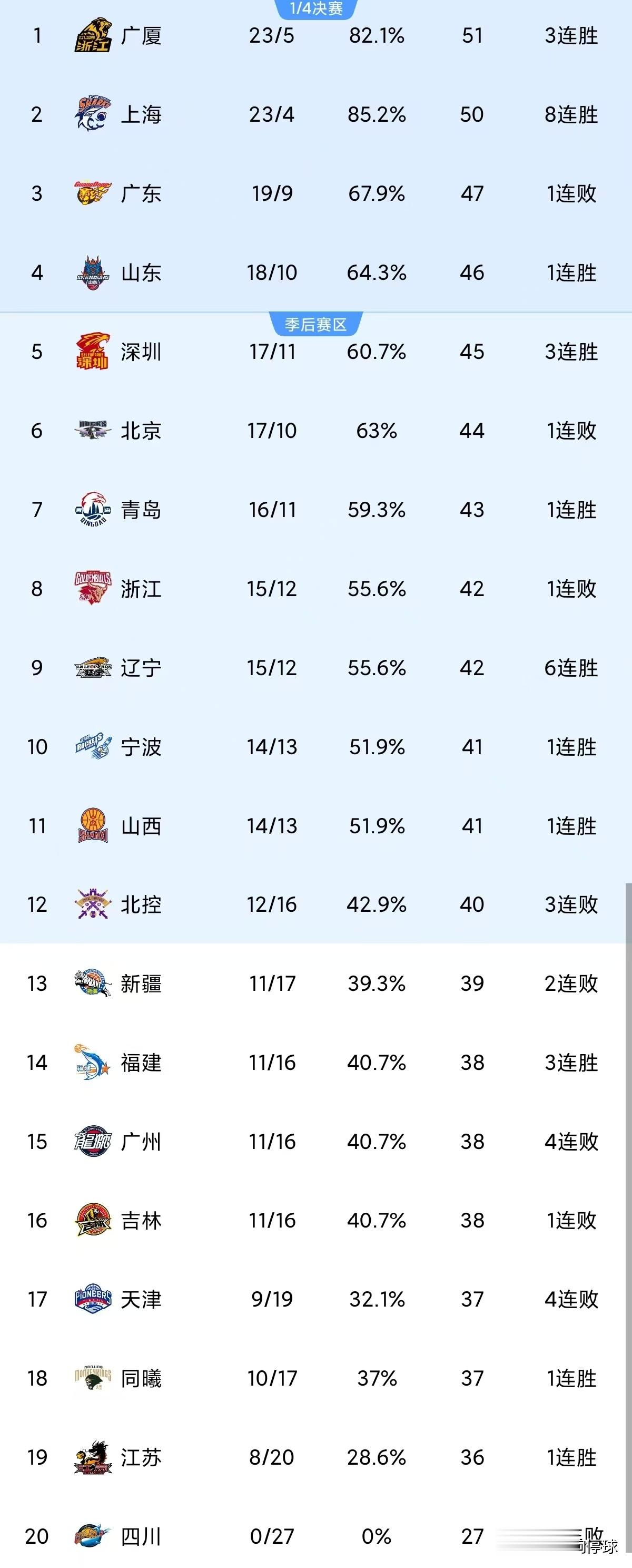 前四名球队没有改变,依旧是广厦、上海、广东与山东,但是广东爆冷输球后,已经到了四强边缘,后面多队都有反超的可能,如果广东不调整状态,一到两轮后就四强难保了。随着今晚比赛结束,CBA排行榜更新如下: