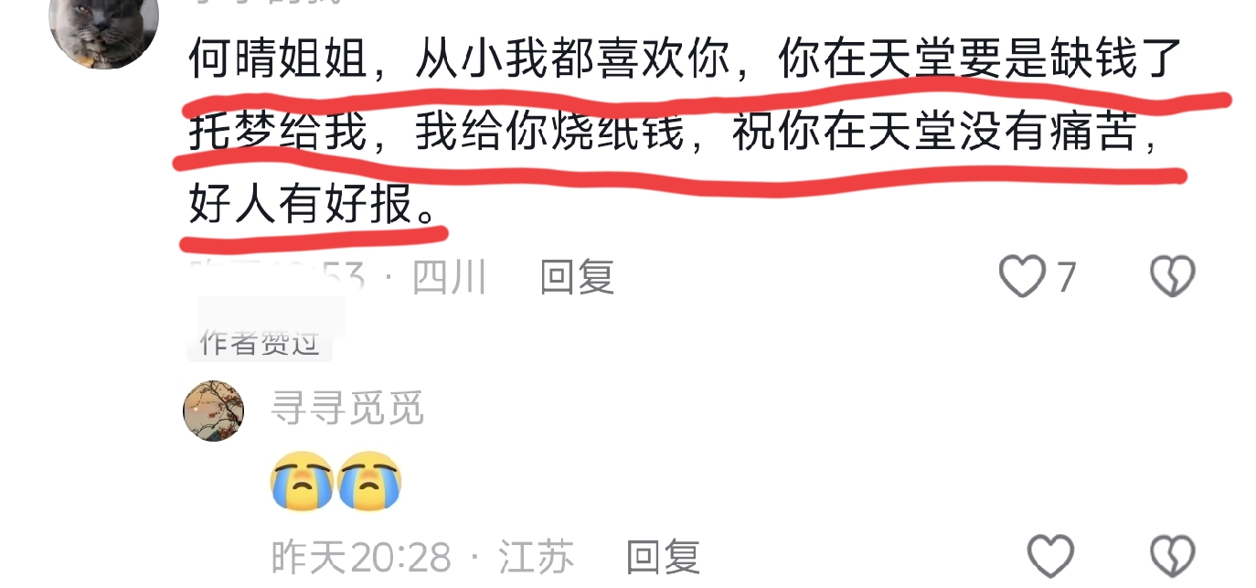 这位网友说:何晴姐姐,从小我就喜欢你,如果你在天堂缺钱了,托梦给我,我给你烧纸钱,愿你在天堂没有痛苦,好人有好报