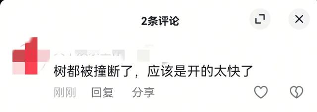 网友二:路边的树木全被撞断,可见车辆行驶速度过快。