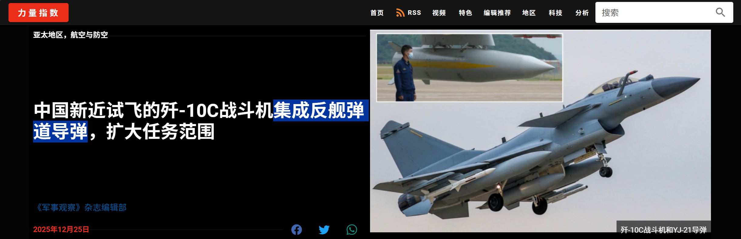 若网络上出现的歼10机腹下挂载的那枚导弹,确认就是鹰击21高超音速导弹的微型化,尽管射程有所降低,但拥有强悍的反舰作战能力,中国空军的对海打击就又多了一款机型。