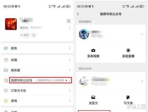 三、视频号入口升级,创作更便捷在微信“我”的页面,视频号入口已合并为“视频号与公众号”,并显示上周流量统计。