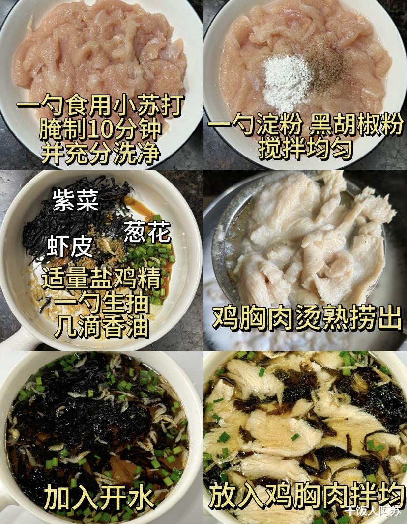 这道汤的核心食材是鸡胸肉和紫菜。鸡胸肉是优质蛋白质的来源,脂肪含量低,能为身体提供充足的能量,同时增加饱腹感;紫菜富含碘、钙、铁等矿物质,以及膳食纤维,能促进肠道蠕动,帮助消化。两者搭配,营养均衡,口感丰富,既能满足味蕾,又能助力减脂。