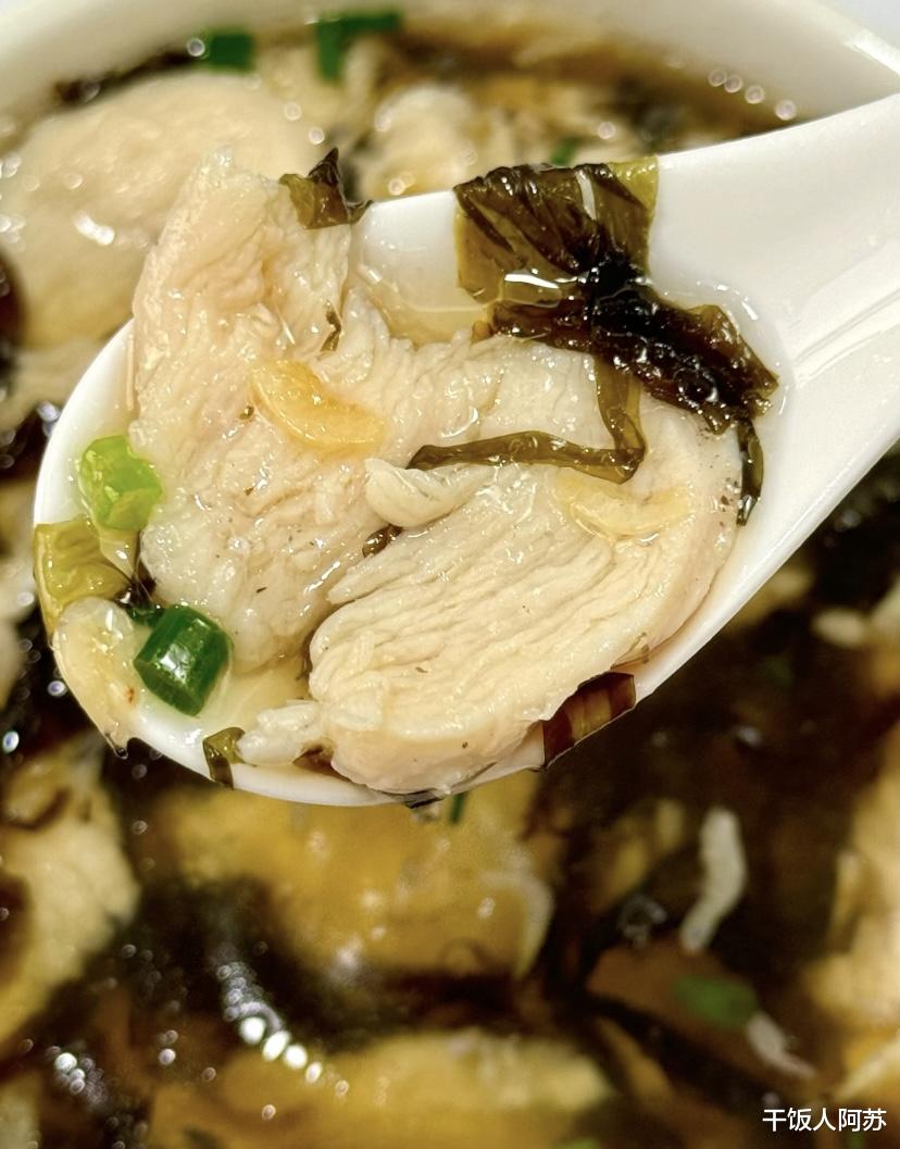 最后,将煮好的鸡肉片放入汤底中,搅拌均匀,一碗鲜美的鸡胸肉紫菜汤就完成了。这道汤的做法虽然简单,但有几个小技巧能让它更好吃。首先,鸡胸肉用小苏打腌制后洗净,能有效去除腥味,同时让肉质更嫩滑。其次,淀粉和黑胡椒粉的加入,能让鸡肉片在煮制过程中保持嫩滑,不会变老。最后,汤底中加入虾皮和香油,能提升汤的鲜味和香气,让整道汤更加美味。