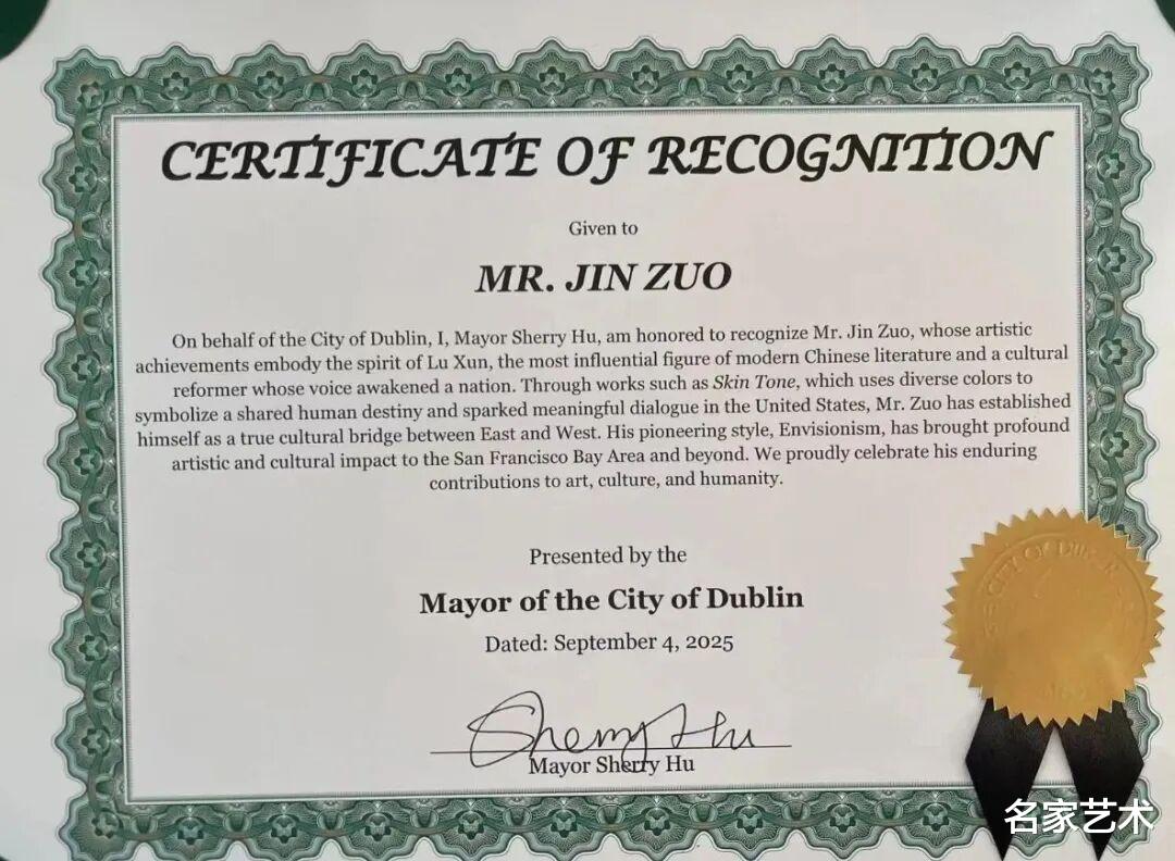 旧金山湾区都柏林市长Sherry Hu颁发荣誉证书,授予左晋先生“当代鲁迅"称号