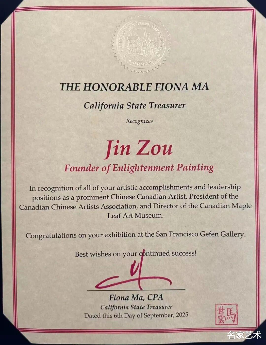 在旧金山市中心GEFEN画廊受到加州财政部长马世云的嘉奖。肯定左晋在艺术领域的杰出表现,作为悟象派的创始人获得艺术杰出贡献奖。
