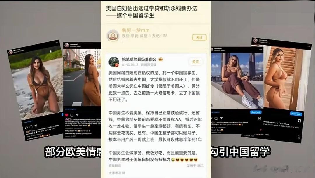 部分欧美情感博主公开撺掇白人女性勾引中国留学生,小红薯的很多平台已经出现,宣传嫁给中国留学生,可以赖掉国内的债务!