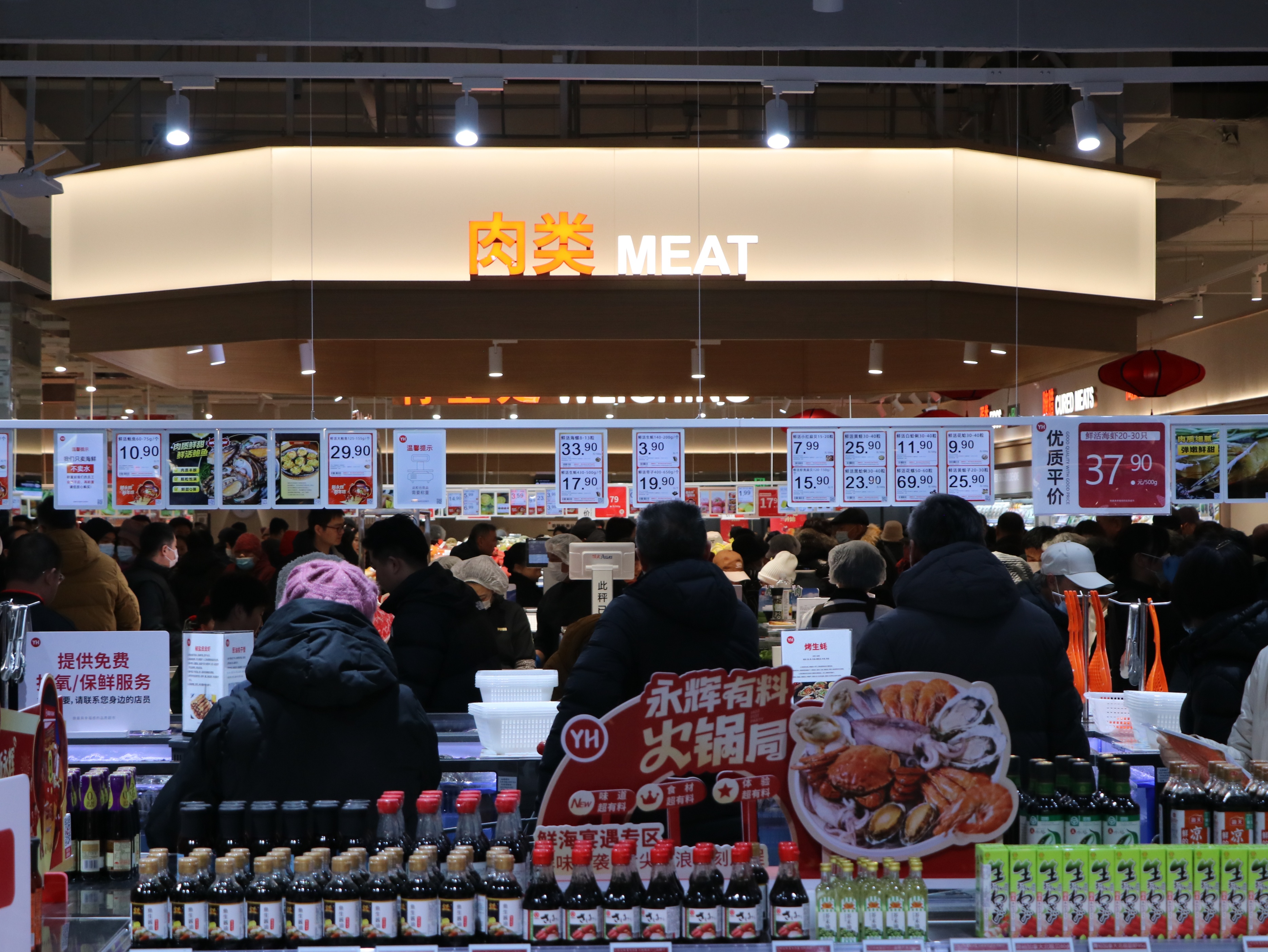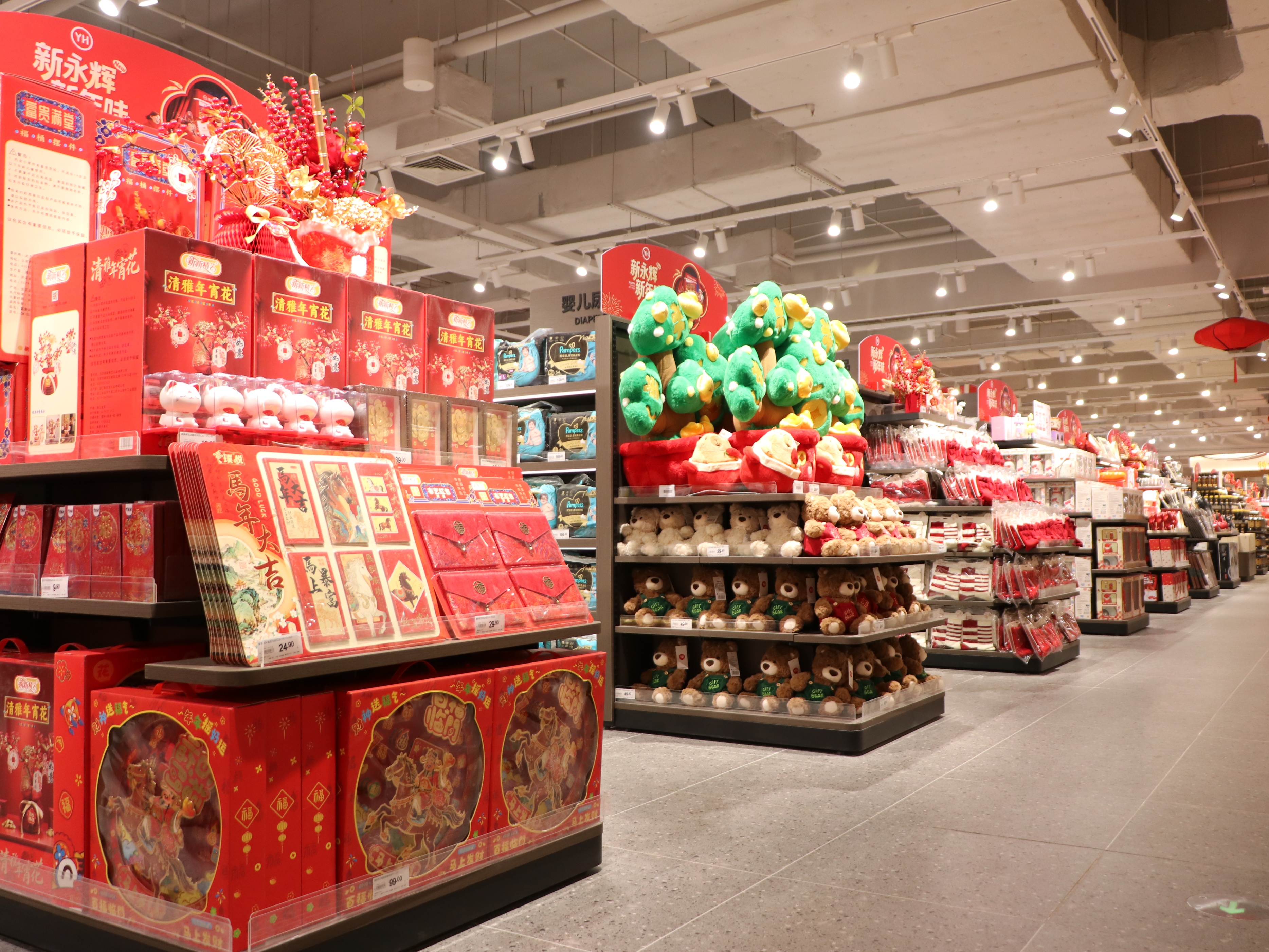 红火的春节吊幔、喜庆的灯笼与福字、琳琅满目的年货礼盒……2026年1月31日,置身于永辉超市北京龙湖长楹天街店,浓厚的年