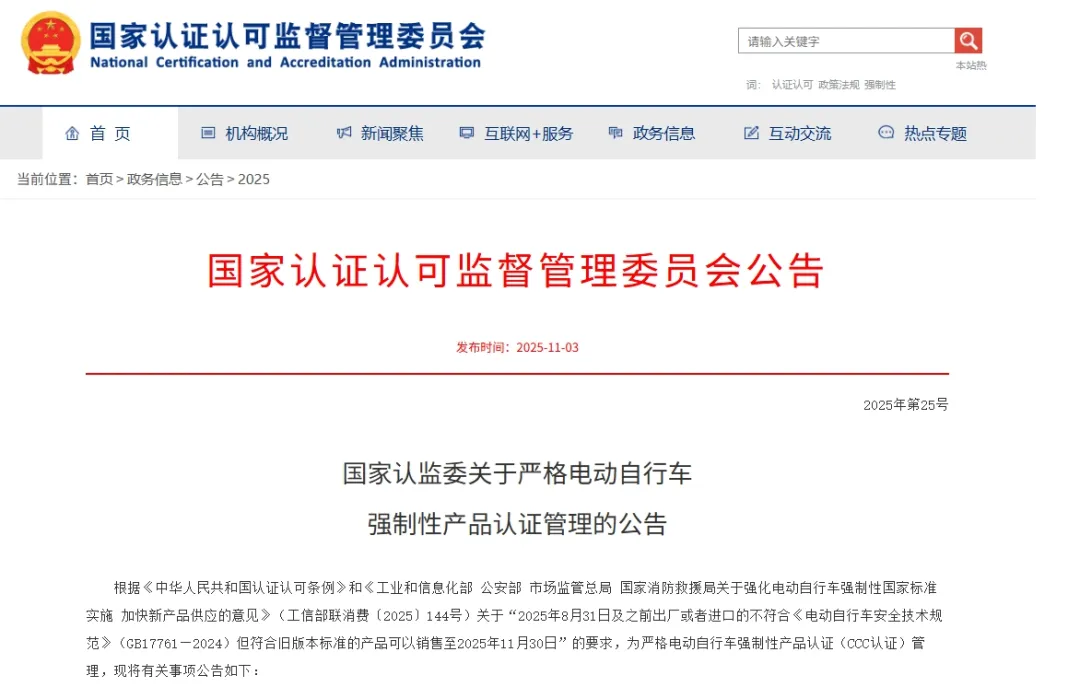 “各电动自行车指定认证机构对依据旧版本标准出具的有效3C认证证书,于2025年12月1日全部予以注销。对依据旧版标准出具、处于暂停状态且不能恢复有效的CCC认证证书,于2025年12月1日全部予以撤销。各电动自行车销售企业自认证证书注销、撤销之日起不得继续销售。”