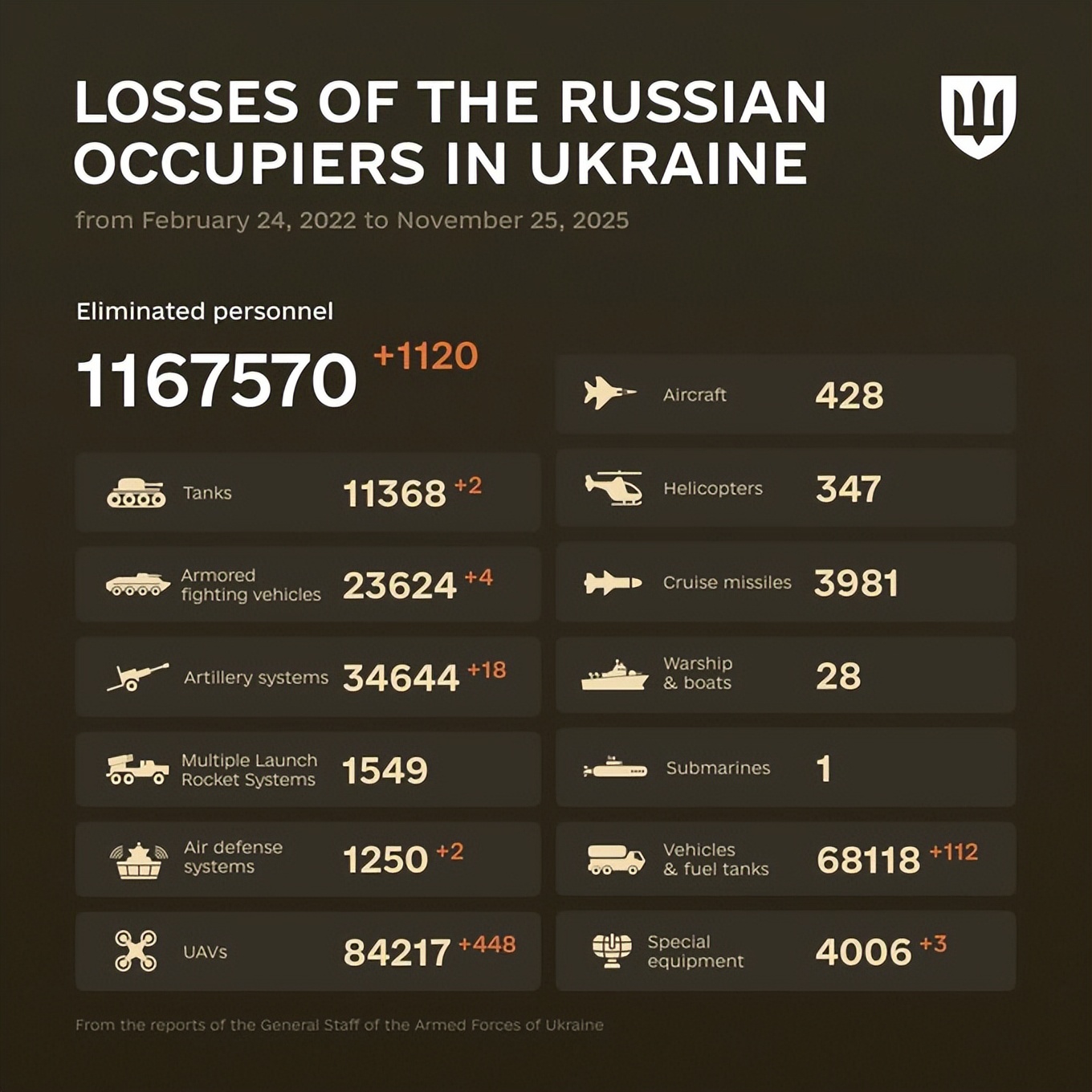 乌总参公布的昨日战果,歼敌(毙+伤)1120人。