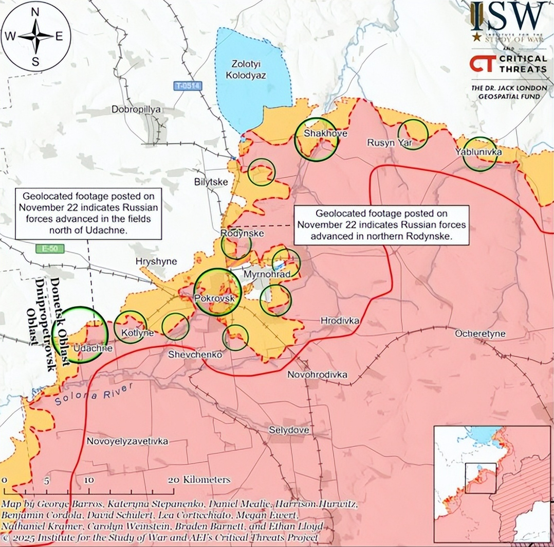 ISW评估认为,俄罗斯军队的推进速度自阿拉斯加峰会以来有所加快,在8月15日至11月20日期间平均每天打下9.3平方公里。尽管如此,俄罗斯的进展仍然明显受限。即使按照目前这种推进速度(实际上不可能),俄罗斯军队要到2027年8月才能最终占领顿涅茨克州剩余地区。因此,俄罗斯总统普京正试图迫使乌克兰交出这些地区,以节省俄罗斯在乌克兰其他地区可能用到的宝贵时间、精力、人力和资源。
