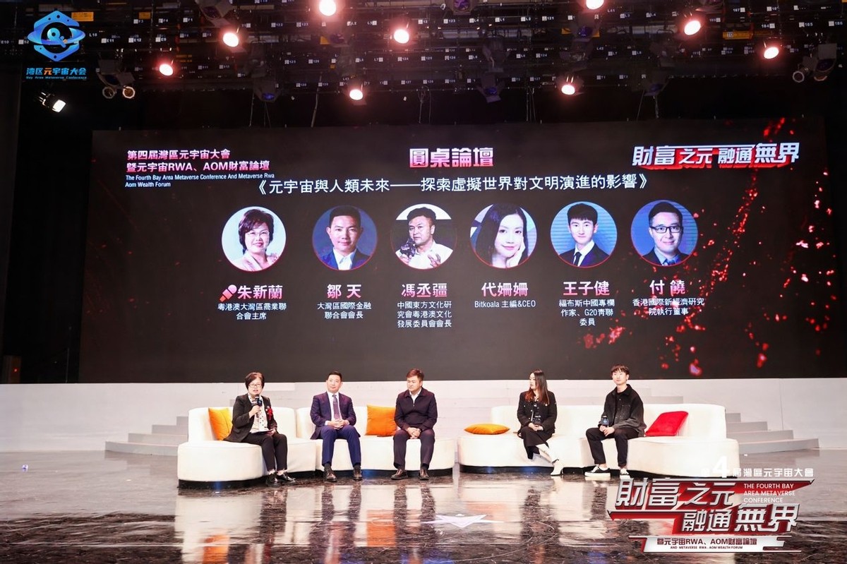晚宴环节精彩继续。脚踏实地,展望未来,粤港澳大湾区商业联合会主席朱新兰以“元宇宙与人类未来-探索虚拟世界对文明演进的影响”为题,召集大湾区国际金融联合会会长邹天,中国东方文化研究会粤港澳文化发展委员会会长冯丞疆,福布斯中国专栏作家、G20青联委员王子健,Bitkoala主编&CEO代姗姗,以圆桌形式展开讨论。