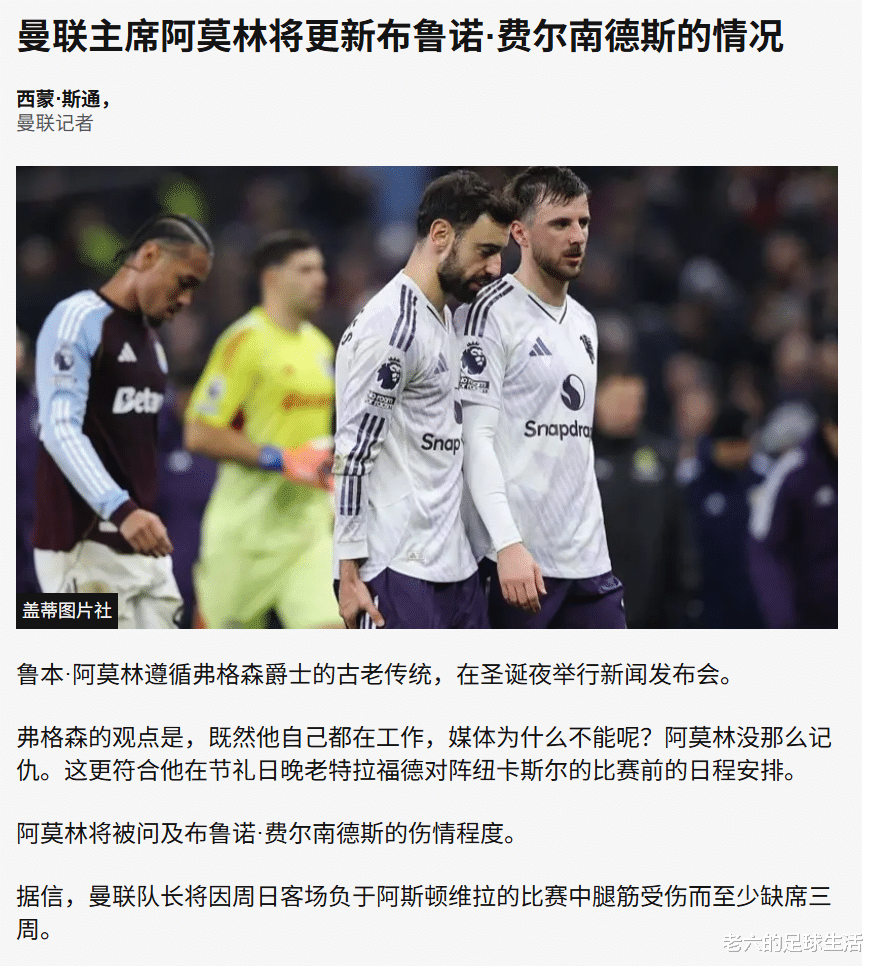 曼联在非洲杯失去了姆伯莫、迪亚洛等人后,上场与维拉的比赛,b费在中场的时候受伤被换下,这是这位铁人自2020年从里斯本竞技加盟曼联以来最长的缺席,他在这五年的时间仅缺席过三场比赛。