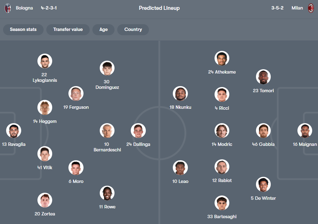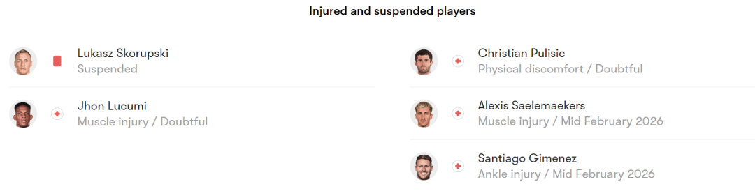 AC米兰虽需抢分巩固争冠优势,但进攻端存在明显短板:主力中锋希门尼斯长期伤缺,冬窗新援菲尔克鲁格尚未完全融入,并且主力冲击手莱奥和普利西奇都有伤在身,莱奥虽然能带伤出战但状态并不在最佳。莫德里奇与拉比奥特的中场组合虽经验丰富,但面对博洛尼亚的中场绞杀,传球成功率可能受影响。