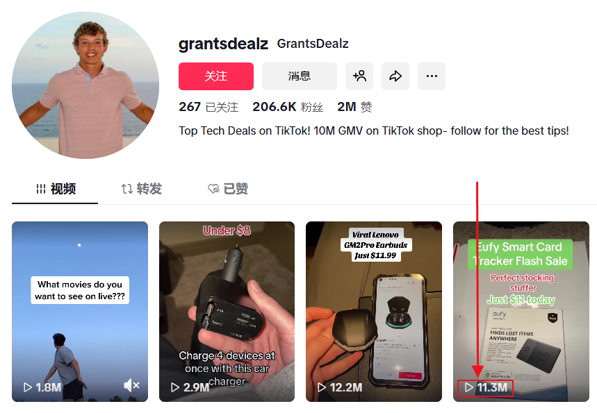 在品牌合作达人的带货贡献榜单中,粉丝量为20.66万的达人@grantsdealz所发布的推广视频,带货销量位居首位。