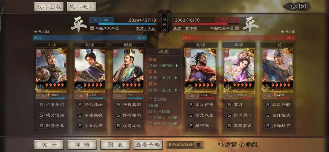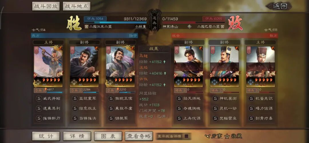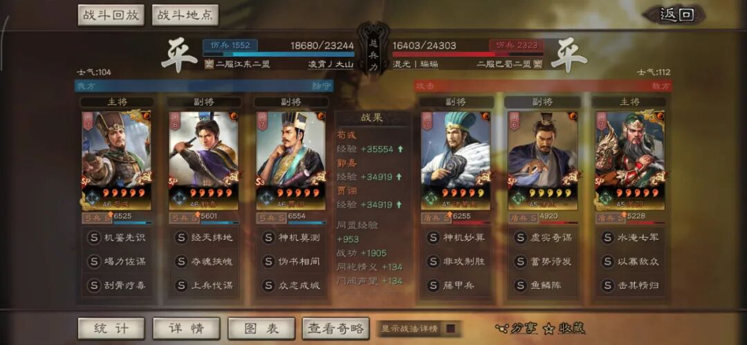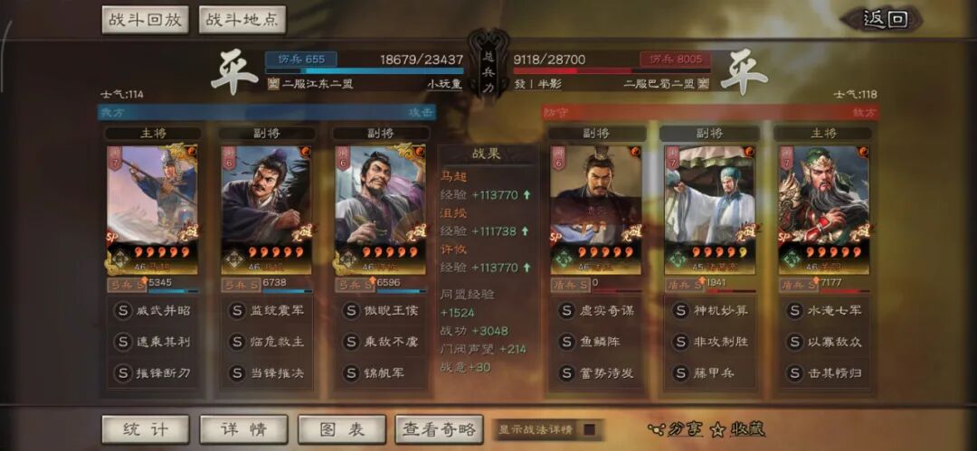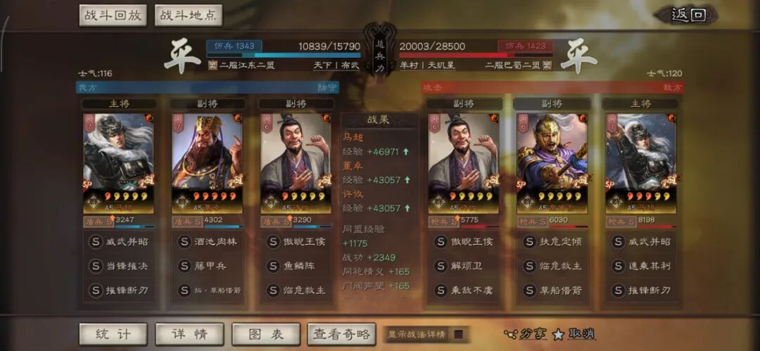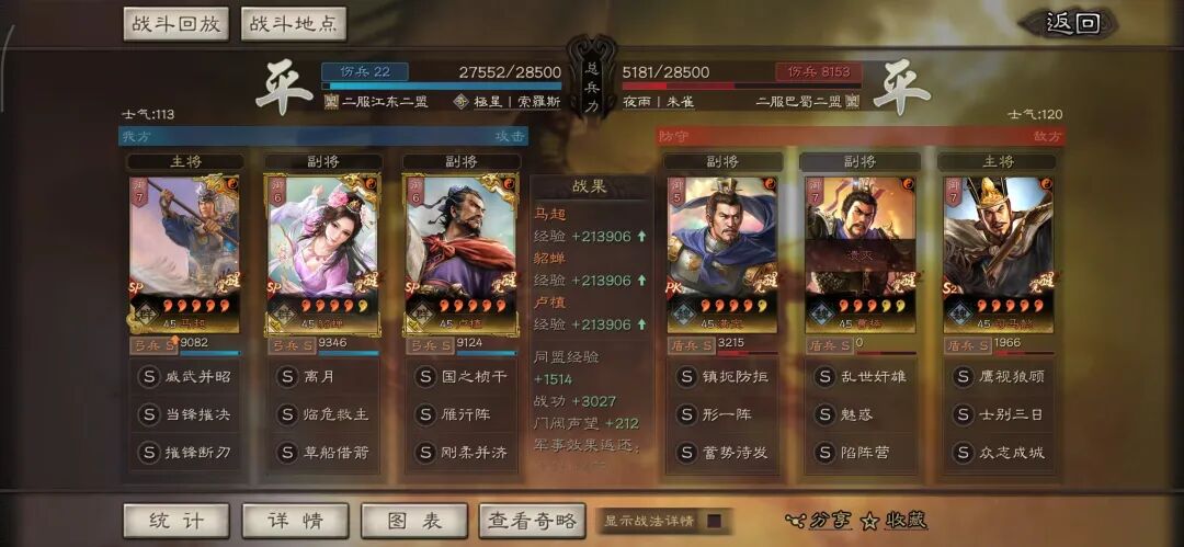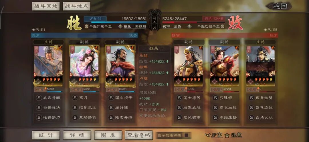 马超可以用全兵种提升S,许攸用弓兵宝物升S。这个阵容其实很多玩家早就想完,在汉剧本终于可以实现了,沮授跟其他两人的联动,尤其是雁形阵联动可以说完美,沮授可以延长(摧锋的减攻、乘敌的虚弱、许攸的虚弱和减属性、雁行阵的转移负面和偷统率),看第一场对战太尉盾,沮授判定了109次。看看其他的对战皇马、法官的战报,都很占优势。