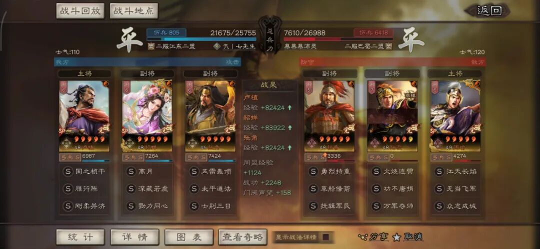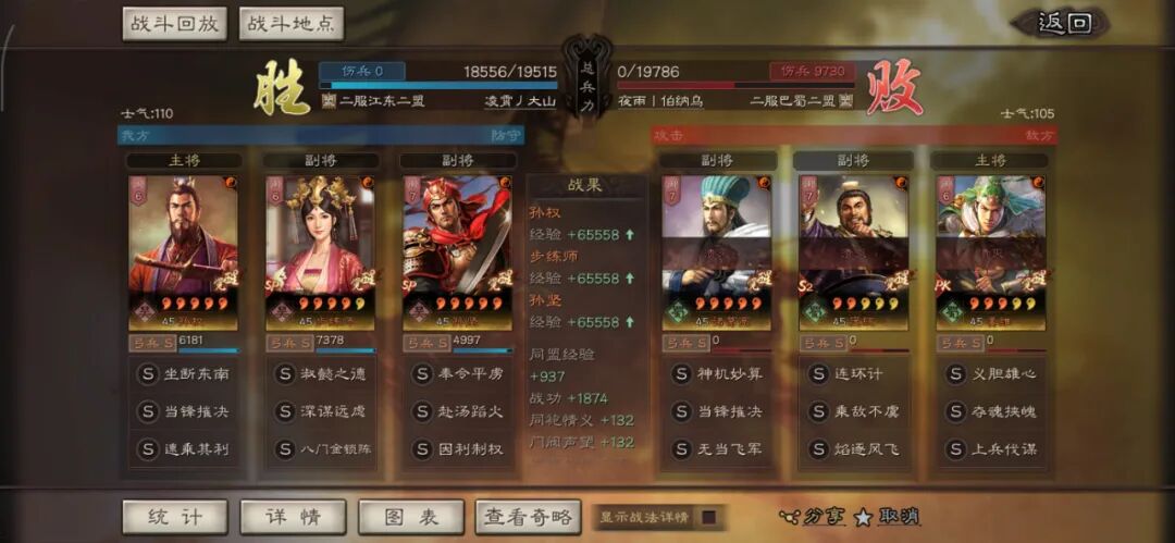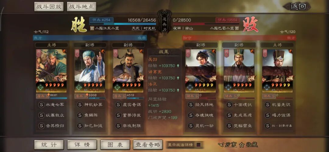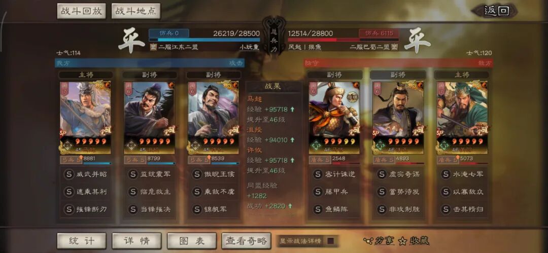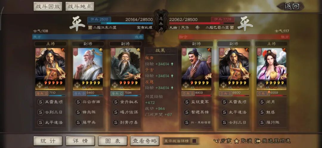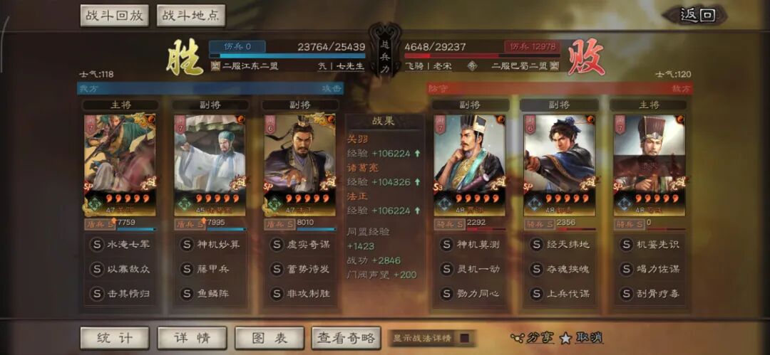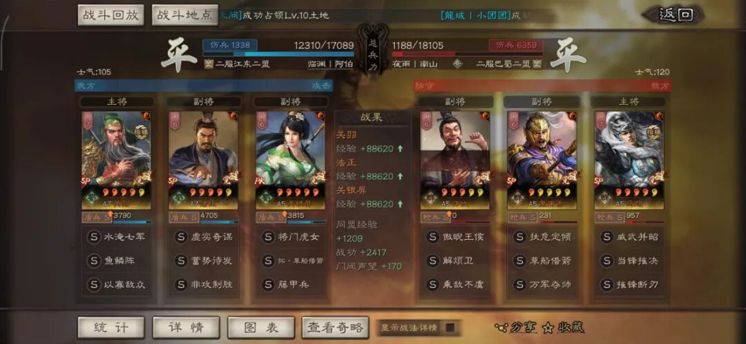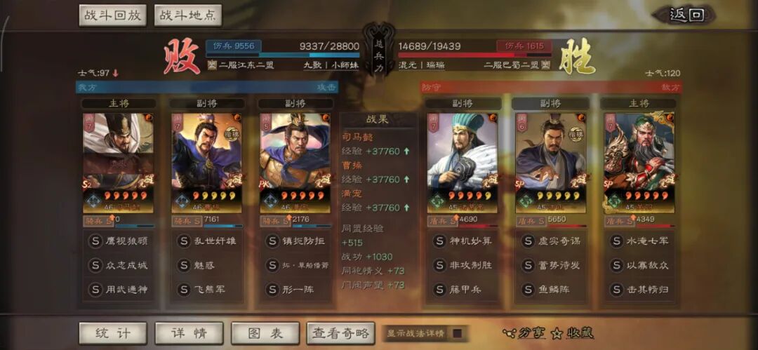 马超可以用全兵种提升S,许攸用弓兵宝物升S。这个阵容其实很多玩家早就想完,在汉剧本终于可以实现了,沮授跟其他两人的联动,尤其是雁形阵联动可以说完美,沮授可以延长(摧锋的减攻、乘敌的虚弱、许攸的虚弱和减属性、雁行阵的转移负面和偷统率),看第一场对战太尉盾,沮授判定了109次。看看其他的对战皇马、法官的战报,都很占优势。