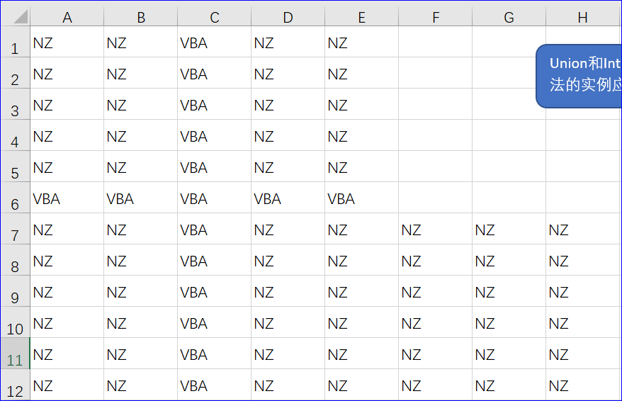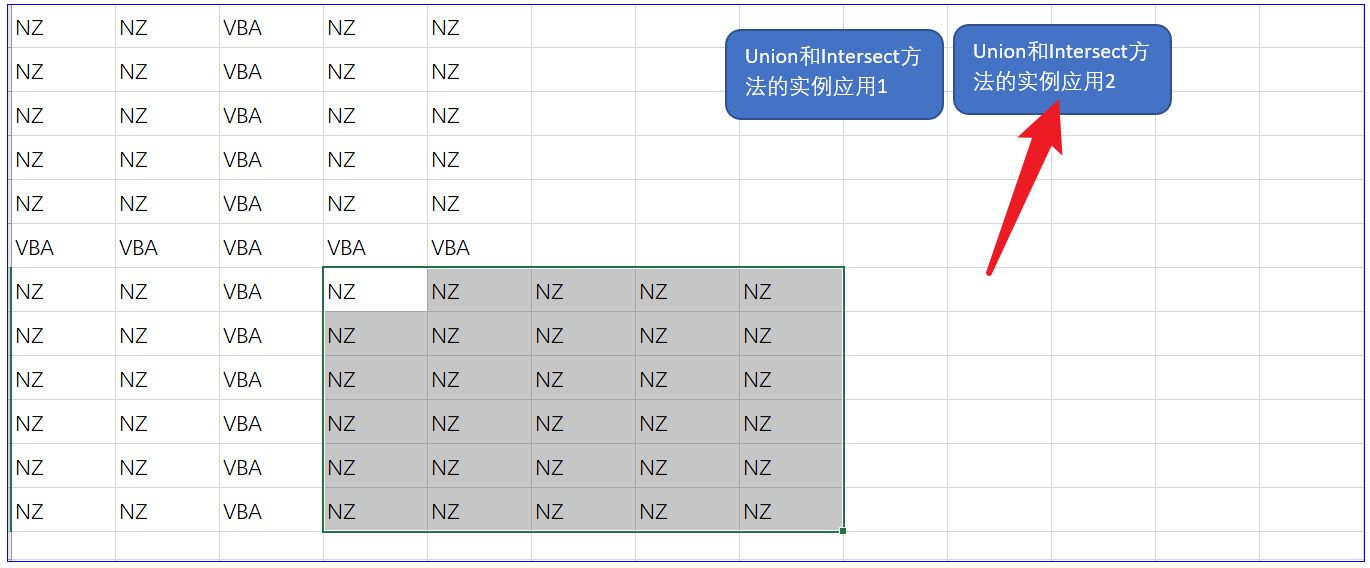 实例二:仍是上面的截图,要求利用Intersect方法实现右下角值为“NZ”单元格的选择: