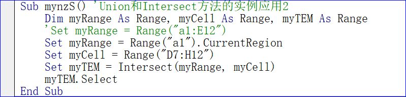 1) 上述代码首先命名了两个单元格区域myRange和mycell,然后利用Intersect方法进行处理。