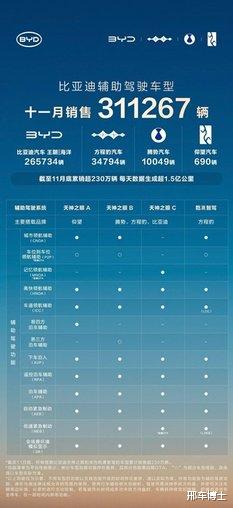 近日,比亚迪公布了其搭载天神之眼辅助驾驶系统的车型在11月的销售数据,全月销量达311267辆,继续引领市场。其中,比亚迪王朝与海洋系列贡献265734辆,方程豹、腾势、仰望等高端及个性化品牌亦表现稳健,共同构筑了比亚迪在智能驾驶领域的强大产品矩阵。