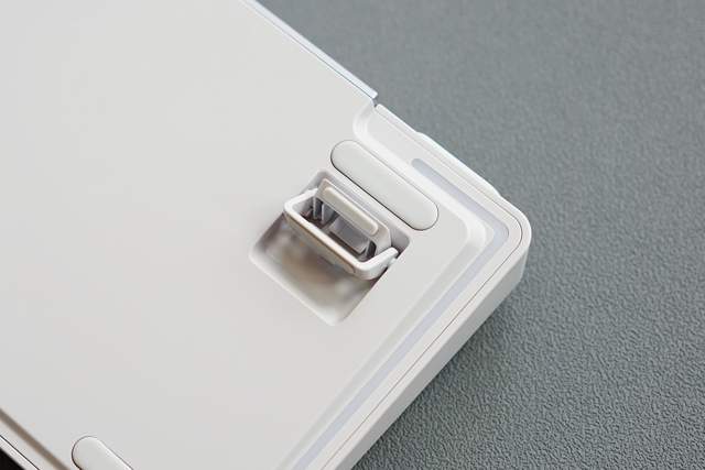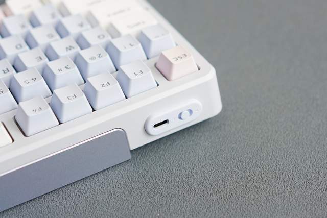 键盘的顶部左侧设计了模式切换开关和USB-C供电接口,方便在有线、无线2.4G和蓝牙5.0模式之间快速切换。