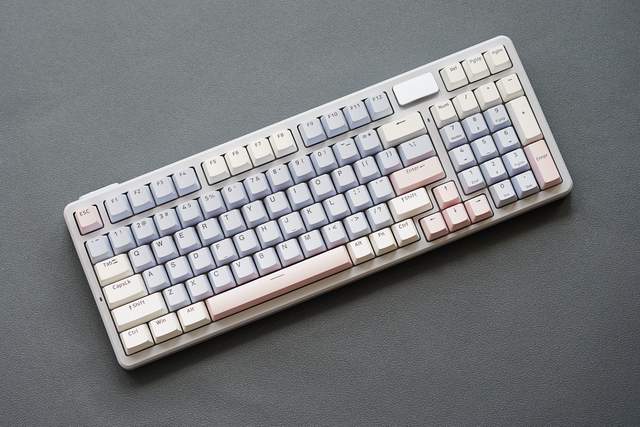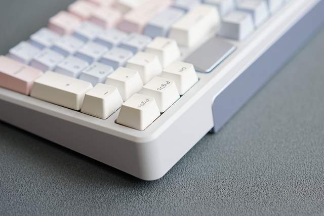 配色方面我这款为莫奈仙踪,键盘整体为奶白色,键帽则采用了灰蓝粉三拼色,风格上简约而富有个性,颜值清新且优雅。