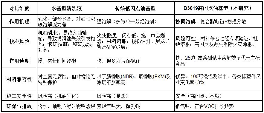 四、与传统清洗技术路线的多维度对比分析为客观评估本项油基清洗技术的适用性,我们将其与当前市场主流的水基型及传统溶剂型(低闪点/高溶胀)产品进行了多维度对比。