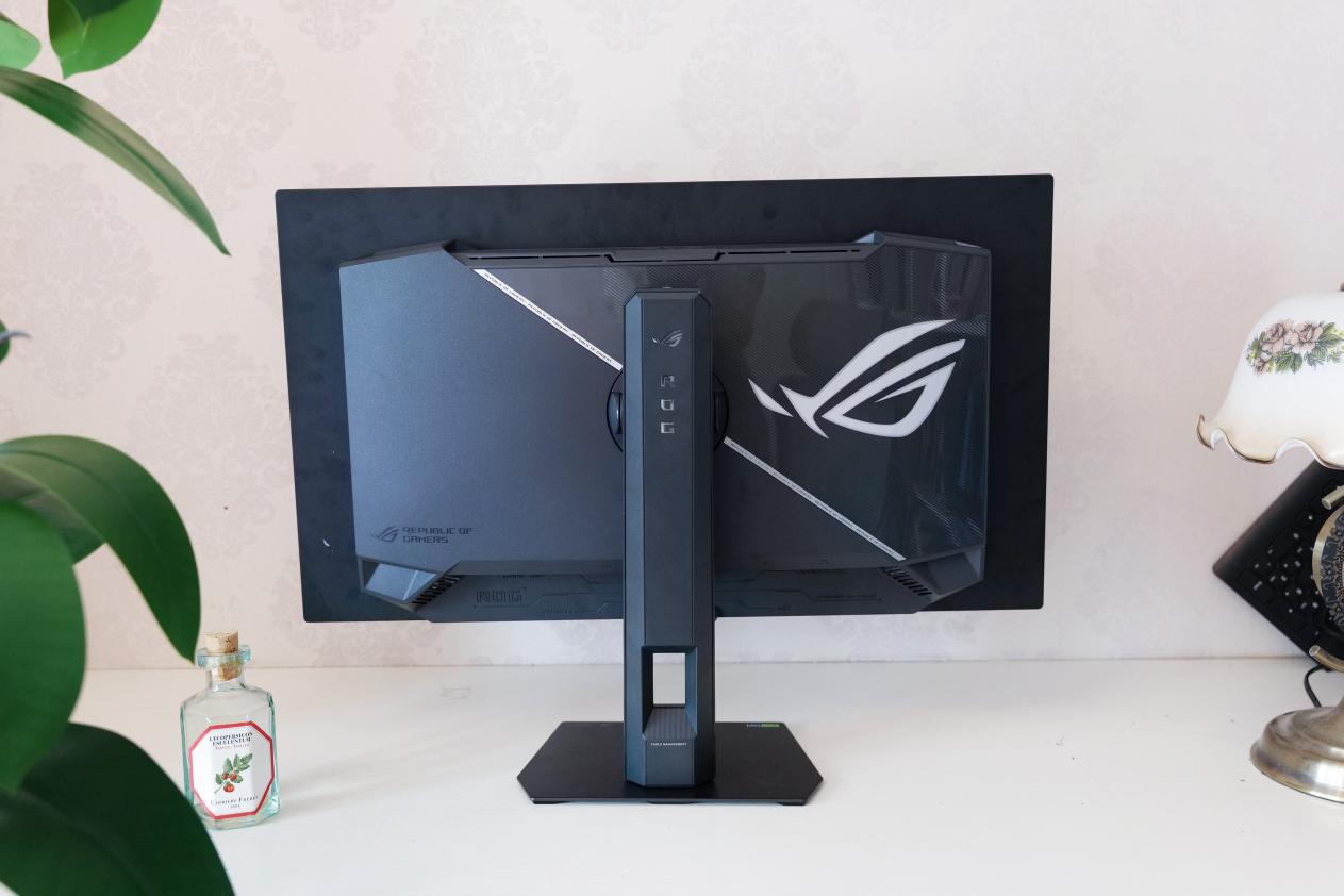 ROG超杀27配有多维度可调节支架,上下可升降、水平可旋转、垂直可旋转90度,俯视仰视角度也可以调整,满足不同坐姿需求,坐着打游戏、躺着看电视都能找到舒服的角度,不过还是建议大家不要躺着看就是了。