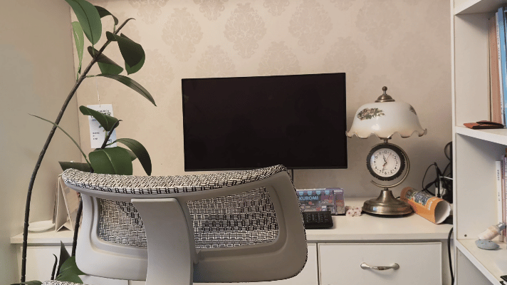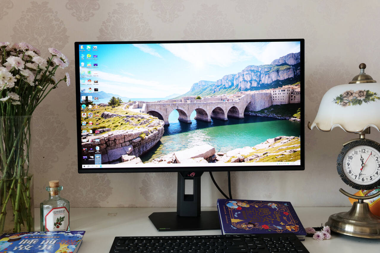 ROG超杀27的支架和底座设计还比较讨喜——全金属梯形底座小巧又稳固,感觉桌面空间都能释放了很多,花花家书房的桌面还是和书架一体的,桌面本来就比较窄,这下桌面还能放点摆件什么的了(娃儿非要放,一点办法都没有)。
