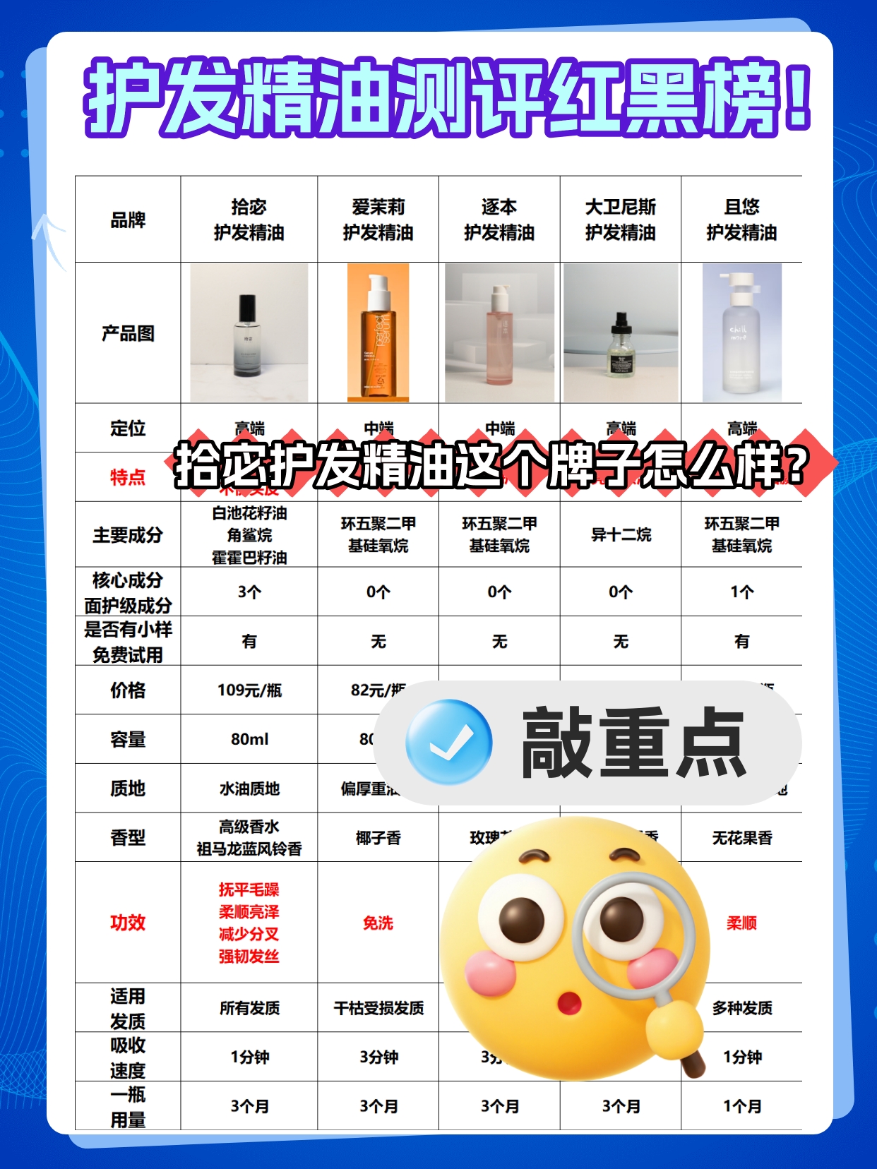 有宝子问某品牌护发精油怎么样,其实选精油不用纠结品牌,关键是要知道如何判断精油好坏,还有护发精油哪些成分安全好用。今天就把这两个核心问题讲清楚,帮大家避开选购误区。判断精油好坏首先看质地,好的精油涂完后能快速吸收,不会黏糊糊的粘手、压塌发根;然后看成分,优先选无矿物油、无人工香精、无有害防腐剂的,植萃成分占比高的更稳妥。再说说安全好用的成分,白池花籽油能抵御紫外线,还能深层滋养;马鲁拉油保湿力超强,适合严重干枯受损的头发;摩洛哥精油能补充角蛋白,改善发丝弹性,这些都是比较靠谱的植萃成分。另外还要看适配度,干性发质可以选滋润度高的油基精油,油性发质选硅基的会更清爽。我测评过很多精油,发现成分简单、适配自己发质的才是最好的。接下来我会分享自己选购护发精油时的一些经验,从成分、质地、适配发质等方面给大家详细讲解,干货满满,先赞收藏不迷路。