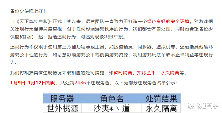 在高收益的驱使下,难免也会有脚本工作室瞅准商机,用科技手段扰乱游戏环境平衡,而《天下贰·经典版》官方也早就做好了积极应对的措施。比如他们在网易内部找来了专业的技术部门合作,严格对脚本行为进行监测,针对异常批量起号的行为进行智能识别与画像圈定。而公测才几天,官方就公告已对违规账号进行了封禁等处理,足以见得官方对守护玩家权益的决心。
