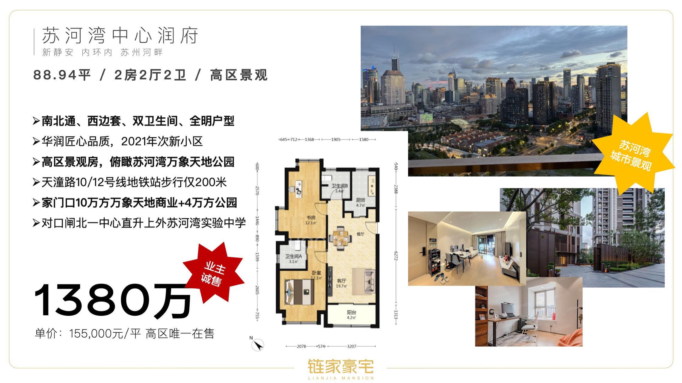 苏河湾中心-润府!88平高区,仅仅1380瓦