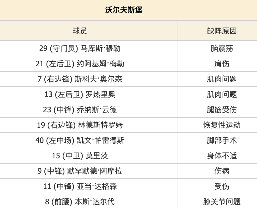 现在的情况就是主队伤病太多了,沃夫斯堡伤病情况堪称灾难,多达8人伤缺覆盖前后场关键位置,其中锋线核心温德、阿莫拉双双缺席,直接导致球队进攻火力锐减,近5轮联赛3场颗粒无收,进攻端只能依赖边缘球员临时拼凑,阵容深度严重不足。