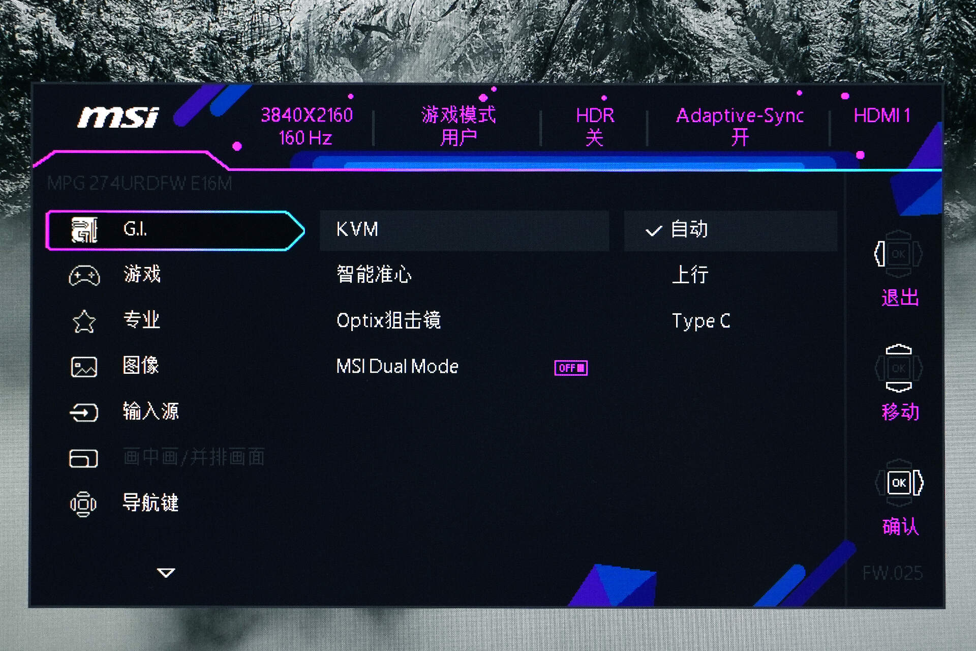 前文提过,微星MPG 274URDFW E16M白龙最大的亮点是“双模”切换技术,通过显示器底部的多向摇杆进入OSD菜单,在MSI Dual Mode选项中切换4K@160Hz(3840×2160分辨率)和1080P@320Hz(1920×1080分辨率)两种模式,切过程仅需3秒即可完成,无需重启电脑。