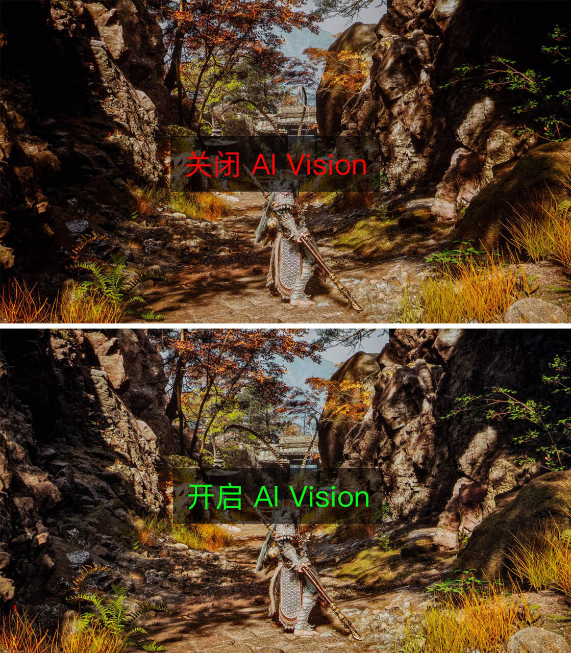 在OSD菜单中的AI VISION功能可以增强画面的整体亮度和色彩饱和度,尤其在玩暗黑风格游戏时,画面清晰度和细节的丰富度会有质的提升。不同于传统的全局提亮(会使原本明亮的区域过曝泛白),AI VISION能够智能识别画面中的暗部区域并进行提亮,同时保持亮部细节不变 。