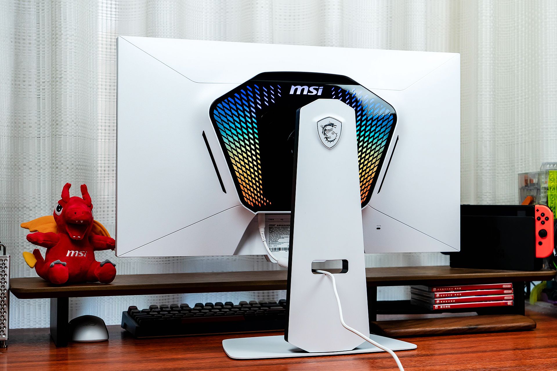 微星显示器必不可少的龙盾LOGO被安置在宽大的底座支架上,设计师还特意做了一个盾牌造型的底座,视觉上协调统一,丝毫没有影响背部的美感。