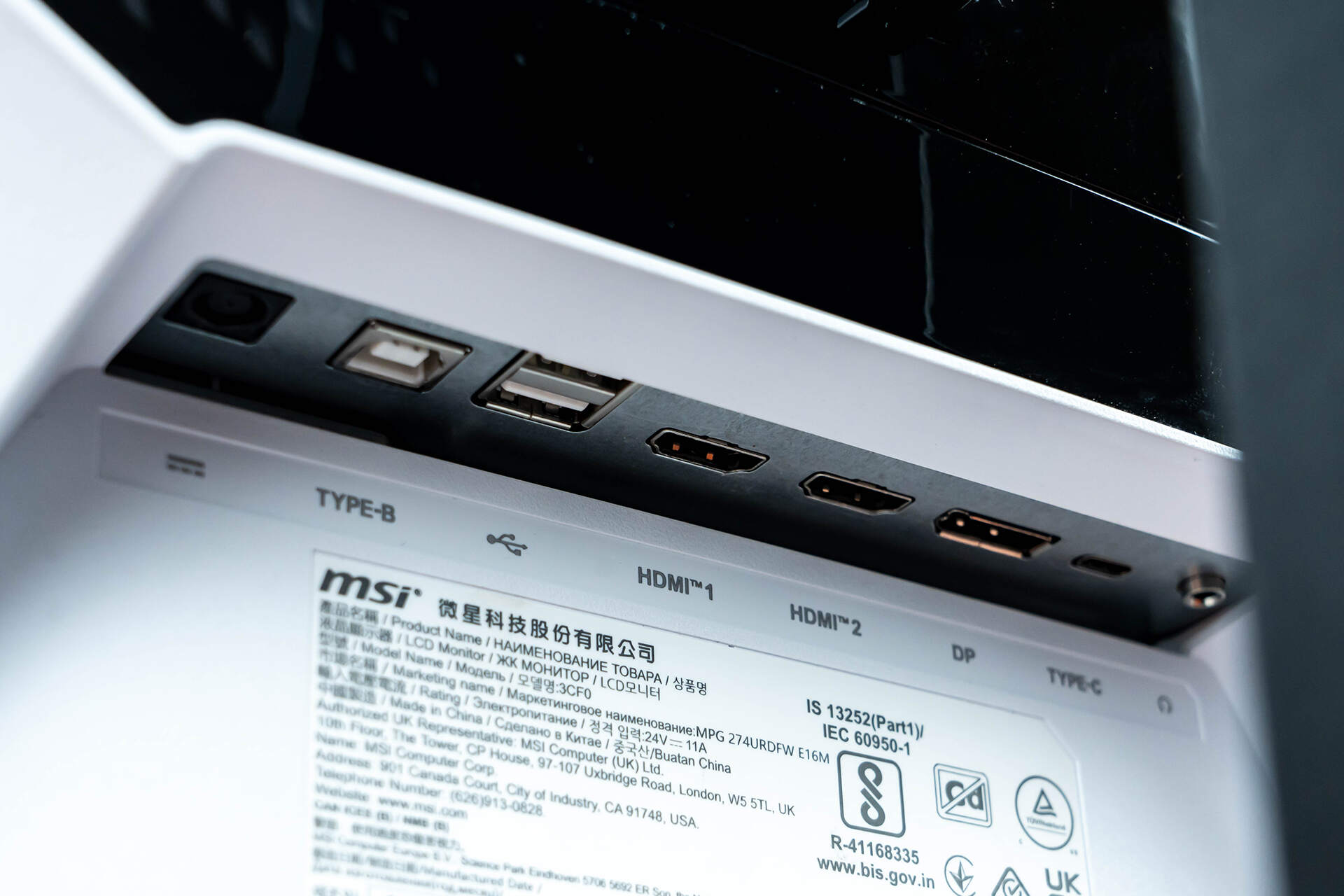 微星MPG 274URDFW E16M白龙有丰富的扩展接口,从左往右依次为:电源接口、USB 2.0 Type-B上行接口、2xUSB 2.0 Type-A接口、2xHDMI 2.1接口、DP 1.4a接口、USB Type-C接口、3.5mm音频接口。其中,HDMI 2.1提供48Gbps满血带宽,可以完美支持PlayStation 5和Xbox Series X等游戏主机在4K分辨率下以120Hz刷新率运行,并支持可变刷新率 (VRR) 和自动低延迟模式 (ALLM) ;Type-C接口支持DP Alt-Mode视频传输,并提供90W的充电,适用于为手机、平板或小型外设充电。