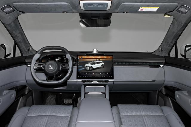 坐进车内,给人感觉就是温馨不浮夸。环抱式仪表台用硬朗的走线贯穿全车,双层台面设计衔接门板向后排延展,没有复杂的装饰,却透着一股温和的豪华感。顶棚用的是和极氪9X同款的麂皮绒,摸着手感像羊绒一样细腻,还经过了5万次耐磨测试,孩子在后排抓挠也不容易破损。而且车内VOC排放值只有0.005mg/m³,新车提回来不用长时间通风,就能放心让孩子坐。