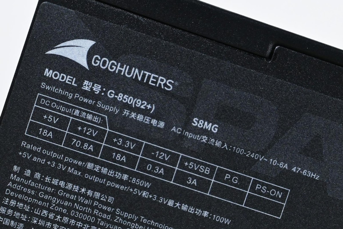 产品细节长城SPARK 850W机身尺寸为150mm x 140mm x 86mm,属于标准14CM短尺寸ATX电源规格,对于ATX/MATX机箱有着较好的兼容性表现;电源本身具备风扇智慧启停功能,在低负载下散热风扇会停转;电源散热滤网更换掉了老款猎金部落HUNTER LOGO,新版更名GOGHUNTER,并采用更有张力的新版鲨鱼鳍造型LOGO。