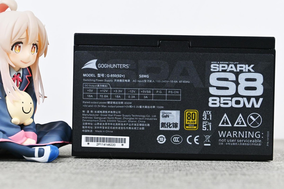 来到铭牌区域,上面带有标称输出信息和各类认证标识,电源中国制造,长城SPARK 850W的实际型号名称为G-850(92+);在输出参数部分,长城SPARK 850W是一款单路+12V输出的计算机电源,+12V标称可承载电流标称为70.8A,应对9700X这类主流CPU+RTX5080是没问题的,如果是使用解锁功耗限制的9950X又或者RTX5090之类的顶级用户,建议加钱买1200W/1600W的fire系列或者G系列比较妥当,以保证设备工作稳定性。
