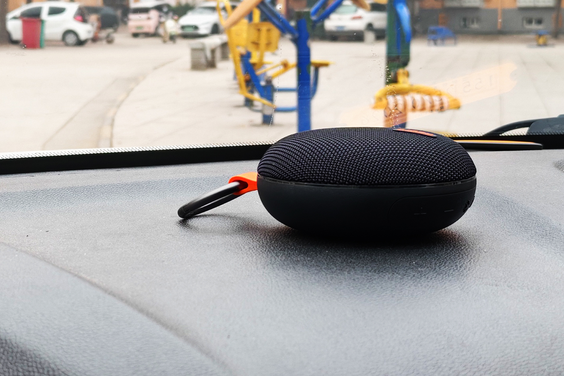 它的IP67防尘防水等级也值得一提。机身网布包裹紧密,底部配备防滑软胶,侧面还有防水塞设计,在户外遇到沙尘、小雨都能从容应对,不管是露营、爬山还是海边玩耍,都能放心使用。续航方面,内置1000mAh大容量电池,在80%音量的特定条件下可连续播放5小时,日常通勤、短途出行完全够用,不用频繁充电,出门携带没有电量焦虑。