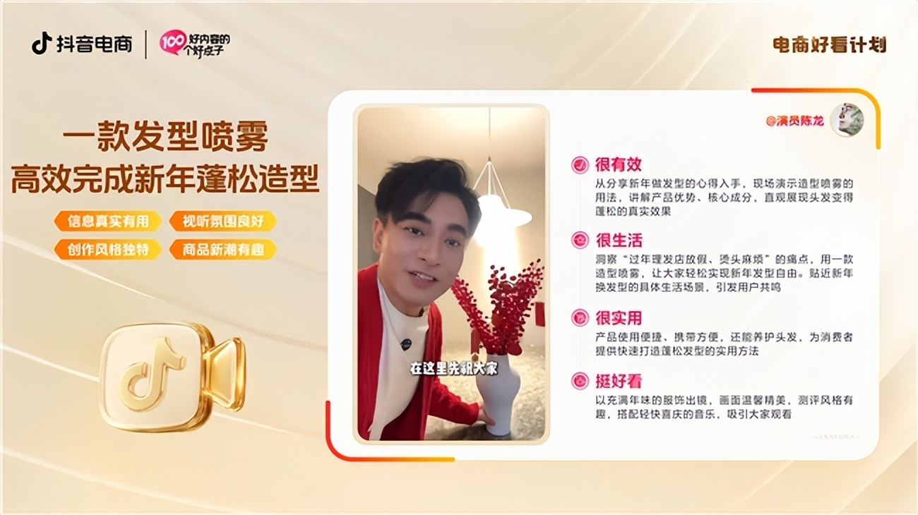 以 @演员陈龙 为例,他围绕用户新年做发型的真实困扰,为大家提供好用“发型神器”。作者热情分享新年发型技巧,现场演示这款发型喷雾的用法,介绍核心成分,并用专业证书佐证产品优势,让好产品自己会说话。整体作品年味满满,配合轻快喜庆的音乐,形成抓人的视听体验。