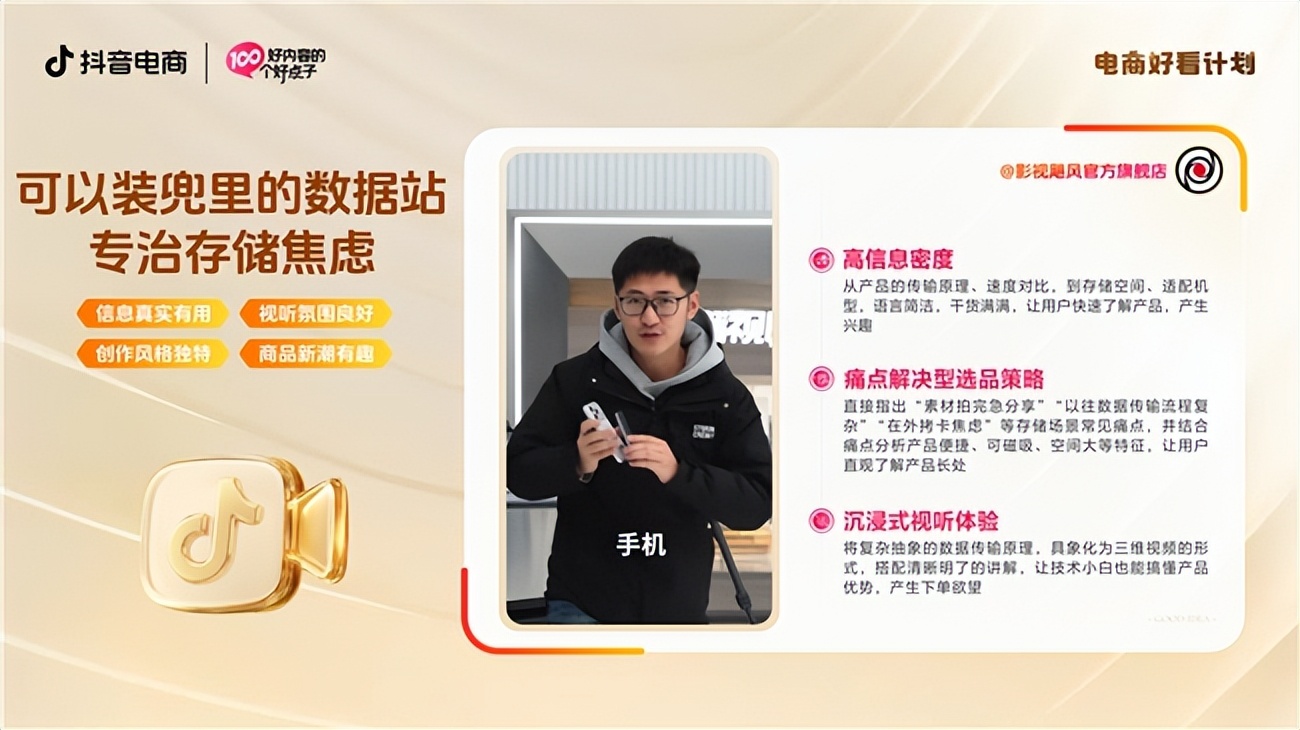 以上视频内容,正是抖音电商「电商好看计划」里的鲜活创作样本。作者们聚焦用户的真实痛点,通过直观的演示、沉浸式的体验,把产品优势变成了用户可感知的价值,以好内容打动用户,实现生意成交。